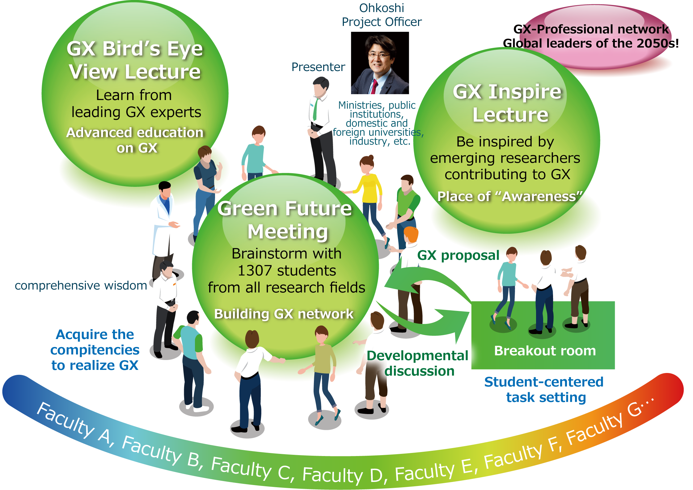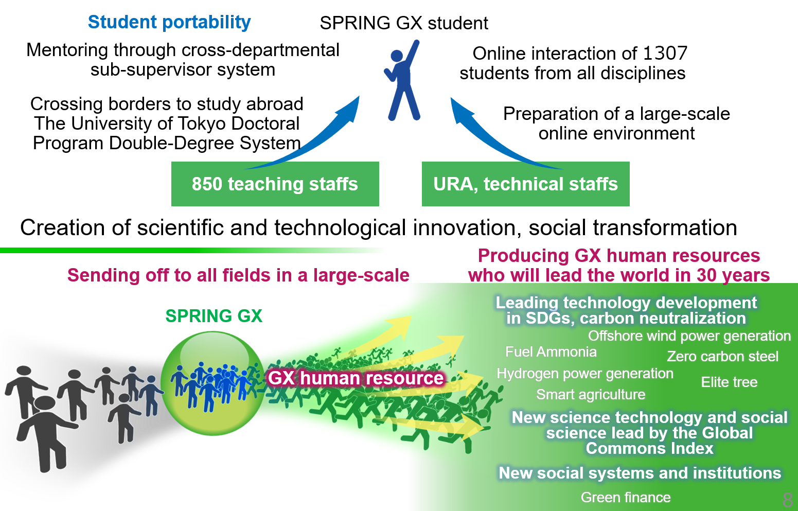 The "Fostering Advanced Human Resources to Lead Green Transformation (GX)" project proposed by Professor Shin-ichi Ohkoshi (Project officer) has been accepted as a program for Support for Pioneering Research Initiated by Next Generation (SPRING) of Japan Science and Technology Agency (JST) from autumn, 2021. Hereinafter this project is referred to as "SPRING GX". 1307 doctoral students from all schools of the University of Tokyo participate in this project.