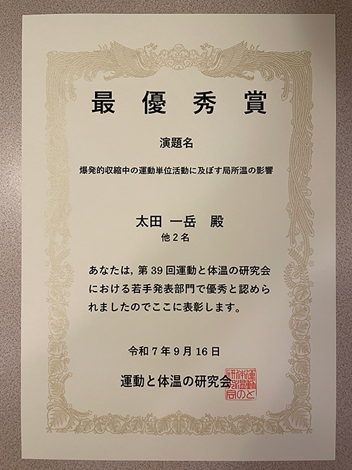 太田一岳さんが第39回運動と体温の研究会における若手発表部門で、「爆発的収縮中の運動単位活動に及ぼす局所温の影響」という題目で、最優秀賞を受賞されました。おめでとうございます!!