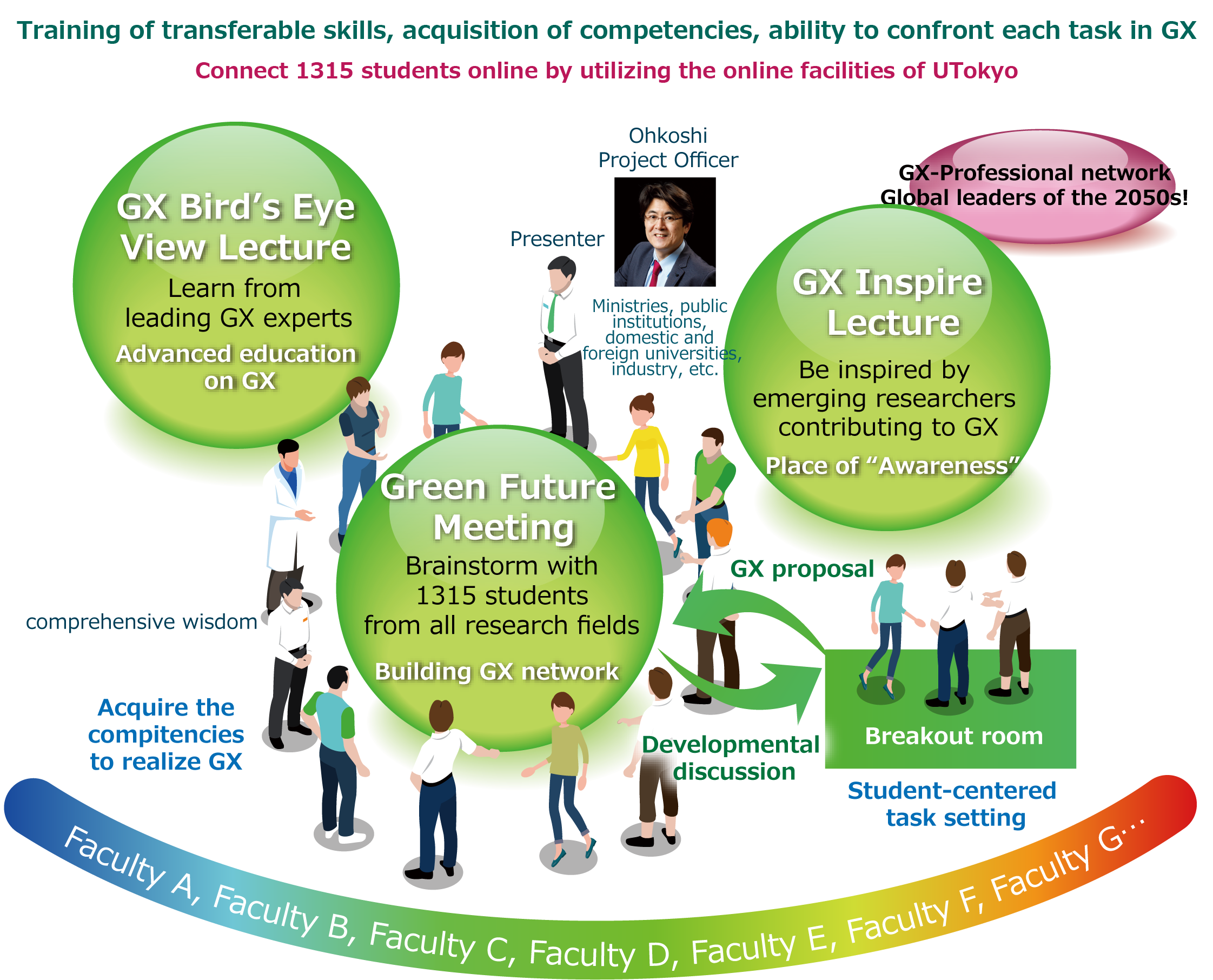Core programs and advanced skill training programs will be provided. The former consists of three programs: a bird’s-eye view lecture series on GX, a green future exchange meeting where students develop the relationship between their own research and GX through exchanges between students across disciplines, and GX-inspired lectures to highlight the relationship between cutting-edge research in various fields and GX. Through these core programs, individual students will embed the GX seeds in their own consciousness. The advanced skill training program consists of overseas training, industry–academia collaboration, and transferable skill acquisition support. Furthermore, educational contents will be developed based on cross-disciplinary programs, which have accumulated achievements at the University of Tokyo World-leading Innovative Graduate Study (WINGS) programs. 1315 participating students will be provided a variety of programs tailored to their individual specialties and circumstances, and students will acquire the ability to fully demonstrate their professional abilities as GX experts in any field. At the same time, a supportive environment will be created for doctoral students to freely carry out challenging and integrated emergent research.